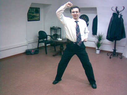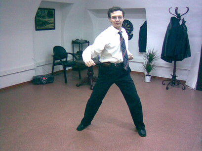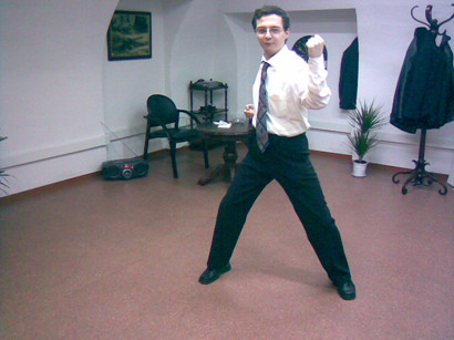 Разберем его в левосторонней стойке. Сжатый кулак левой руки начинает движение от низа живота, подтягиваясь от правого плеча. Правая рука ладонью к земле поднимается в направлении противника. Далее правая рука делает резкое движение в сторону бедра, кулак ее принимает положение для удара, а левая рука описывает полукруг наружу.