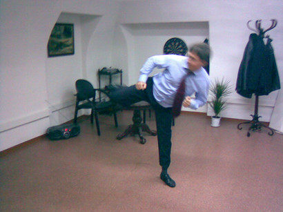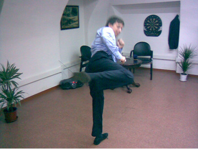 Чрезмерно не наклоняйтесь. Речь идет о всем известном физическом законе: если центр тяжести смещен от центра равновесия – падение неизбежно. С другой стороны, за счет более глубокого наклона и поворота бедер увеличивается дальность попадания удара. Для того, чтобы избежать потери равновесия, в этом случае, следует использовать ударную ногу в качестве противовеса. Однако новичкам не советуется этим злоупотреблять.