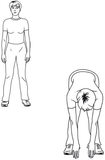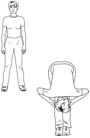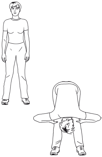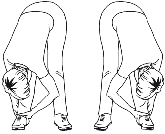 выполните наклон туловища вперед. Обхватите ладонями колени и разведите в стороны локти. Вы как будто хотите просунуть туловище между ног. Задержитесь в этом положении на 10–30 счетов (в зависимости от вашего уровня физической подготовки). Почувствуйте натяжение мышц спины, ягодиц и задней поверхности бедра. Затем расслабьтесь и вернитесь в исходное положение.