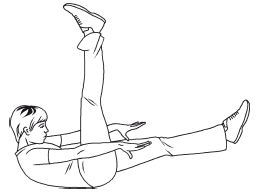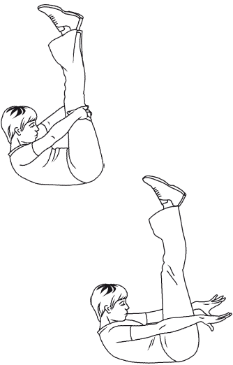 Техника выполнения: в этом положении плавным движением медленно поднимите к груди колени, одно за другим и выпрямите ноги вверх. Обхватите руками заднюю поверхность бедер и разведите локти в стороны. Медленно поднимите над поверхностью голову и плечи, округляя спину. Затем вытяните руки вперед, параллельно поверхности и медленно, с амплитудой в несколько сантиметров, выполните движение руками вперед-назад. Если вы почувствовали напряжение в области шеи, согните руки в локтях и положите на затылок.