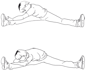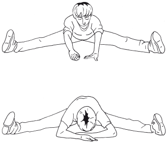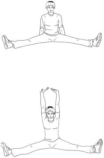 Исходное положение: сидя на поверхности, ноги раздвинуты в стороны настолько широко, насколько позволяет ваша растяжка (но старайтесь избегать болевых ощущений), упор руками сзади.