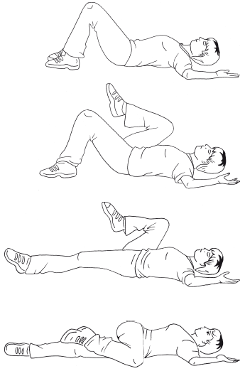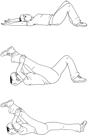 Техника выполнения: в этом положении плавным движением поднимите вверх правую ногу, согните ее в колене и прижмите к груди. Затем отведите ногу влево как можно дальше, при этом плечи и верхняя часть спины не должны отрываться от поверхности. Коснитесь коленом правой ноги пола и медленно, с амплитудой меньше одного сантиметра, выполните движение ногой вверх-вниз. Чтобы вернуться в исходное положение, снова переведите согнутую в колене правую ногу к груди и опустите ее, выпрямляя, на поверхность. Повторите упражнение на другую ногу.