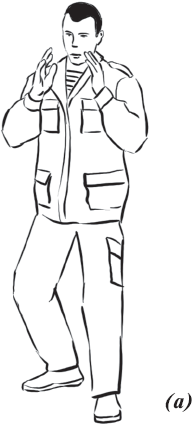 Руки при верхней рамке (рис. 1) согнуты в локтевых суставах и находятся на уровне глаз. Локти слегка прилегают к телу, защищая печень и селезенку, а пальцы являются продолжением кистей рук и предплечий. При нижней рамке (рис. 2) руки свободно располагаются вдоль внутренней или внешней поверхности бедер. Данное расположение рук обеспечивает их наибольшую скорость и точность движений в оптимальном рабочем пространстве с оптимальными усилиями при встрече атак противника или нанесении ему различных ударов.