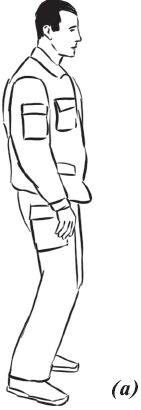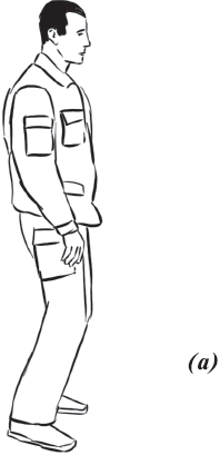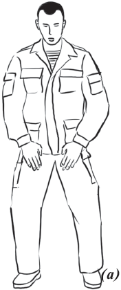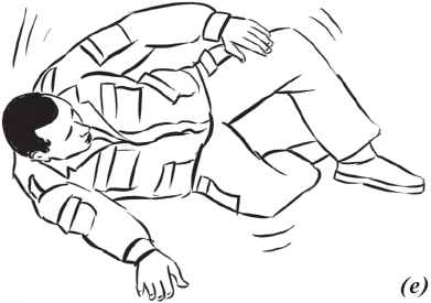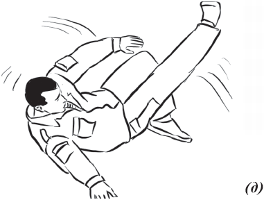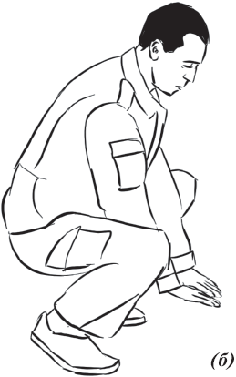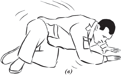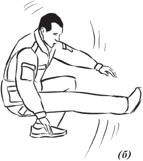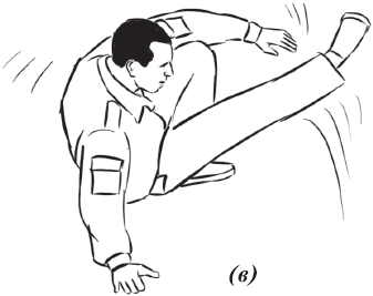 При падении набок (влево, вправо) (рис. 8) необходимо из базовой стойки скрутиться в бедрах и, выбросив согнутые в коленях ноги в сторону (влево или вправо), приземлиться на руки, как при падении на грудь. При этом согнутые в коленях ноги должны составлять между собой угол 90°, угол между бедром согнутой ноги и ее голенью тоже должен составлять 90°, что необходимо для предотвращения повреждений коленных суставов. Голова должна быть приподнята. Показатель правильности выполнения упражнения – бесшумность и мягкость. Необходимо также выполнять его многократно как подготовительное упражнение.