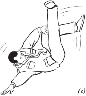 При падении на спину (рис. 9) – из базовой стойки присесть, вытянуть любую ногу вперед (в зависимости от того, в какую сторону совершается падение) и «сесть» опустить таз на пятку опорной ноги разноименным этой ноге бедром. В данном случае – правым бедром на левую пятку. Левая рука тянется за пяткой правой ноги, помогая округлять спину. После этого перекатиться по односторонней широчайшей мышце и перевернуться на всю спину, поджав под себя ступни ног. Этим поджатием гасится энергия, которая забрасывает ноги вверх. Подбородок необходимо прижать к груди. Руками в момент контакта с поверхностью не упираться.