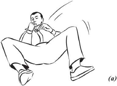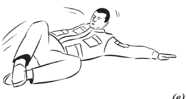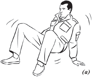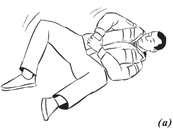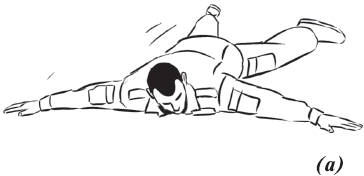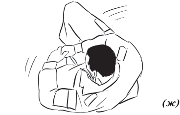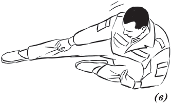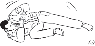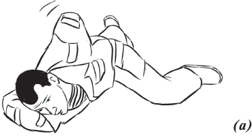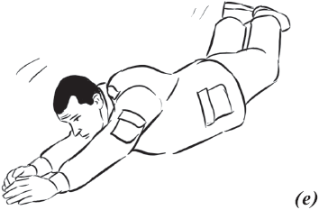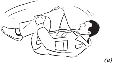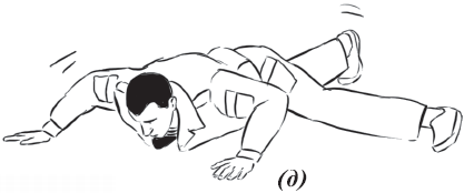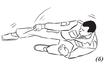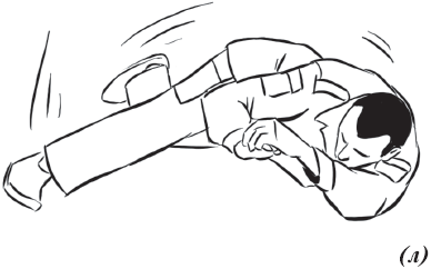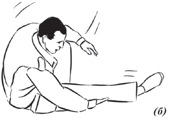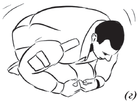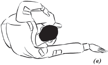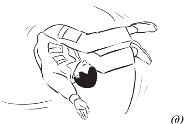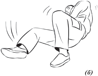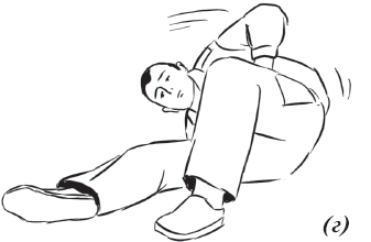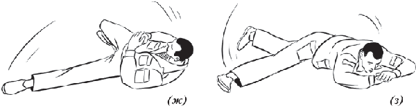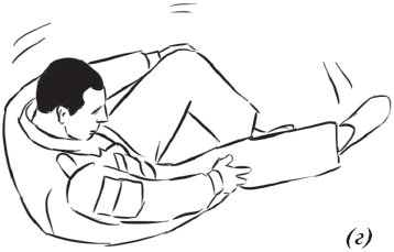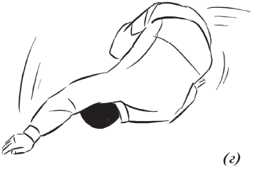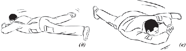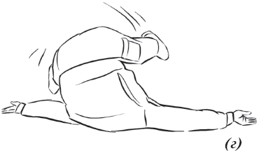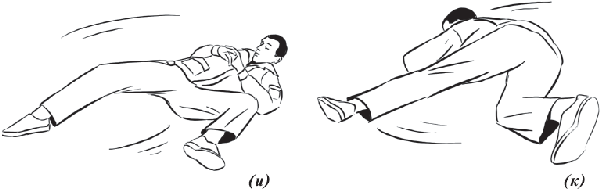Упражнение «велосипед» (рис. 17) выполняется из исходного положения. Делаем падение с вращением и выходом на спину. Руки необходимо держать на коленях и не отпускать, подбородок прижат к груди. Для перемещения в левую (правую) сторону подтягиваем к себе одну из ног, другую вытягиваем. Руки касаются ног, нога тянет руку, рука тянет туловище, за счет этого происходит движение.