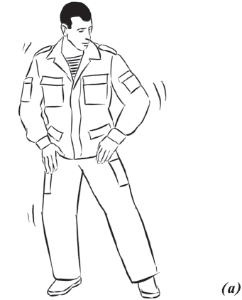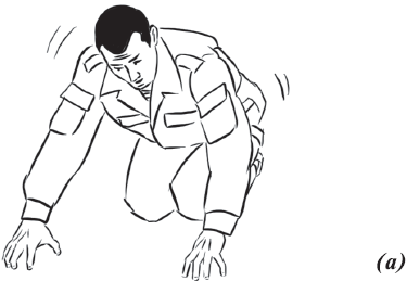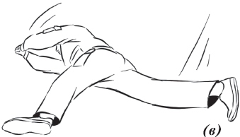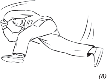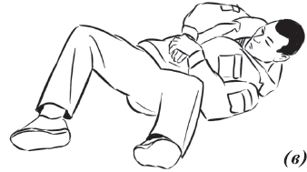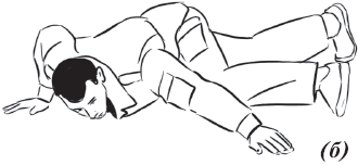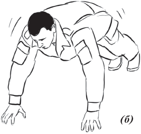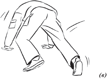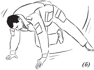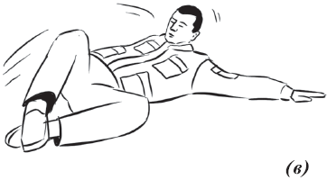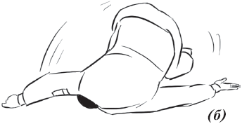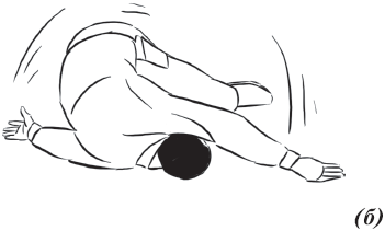 Упражнение «падение с вращением и переворотом на противоположный бок» (рис. 26) выполняется из положения базовой стойки. Во избежание травмирования ладонь направляется книзу. Вторая рука находится в среднем положении: между ногами и головой. Ногу вытягиваем вперед и начинаем вращательное движение. Одноименная рука тянется за пяткой. Принимаем положение самостраховки.