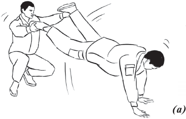 Упражнение «третий лишний» (рис. 28) выполняется тремя обучающимися. Каждый из двоих берет третьего за руку и ногу. После этого (вариант 1) один из них отпускает напарника и страхует его при приземлении. Второй из удерживающих все это время контролирует ход проведения упражнения. Второй вариант предусматривает раскачивание третьего напарника и бросок его. Приземляется он на ноги. Главное в упражнении – отработка элементов самостраховки.