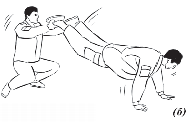 Упражнение «тачка» (рис. 27) выполняется двумя занимающимися. Один принимает упор лежа, другой садится в полный присед и берет напарника за ноги ладонями вверх. Руки выпрямлены и находятся на уровне глаз, спина прямая. У второго напарника все тело вытянуто и напряжено, как струна. После этого начинается движение. Рекомендовано при движении разговаривать или производить счет для работы диафрагмы.