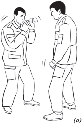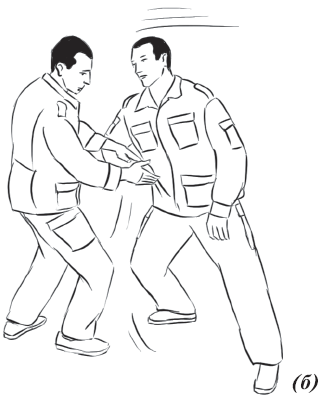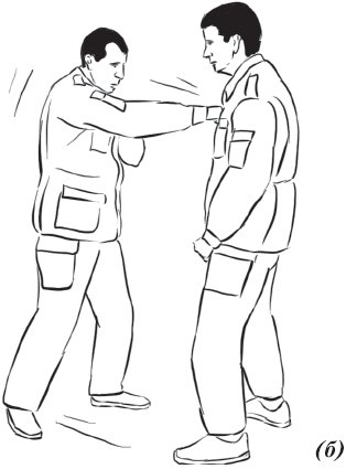 Удары рукой (прямо, сбоку, снизу) наносятся из изготовки к бою. Шагом левой ногой вперед в сторону и подшагом правой, одновременно поворачивая таз и плечевой пояс справа налево, перенося вес тела на впередистоящую (левую) ногу, нанести удар, фиксируя его сжатием пальцев в кулак (рис. 31).