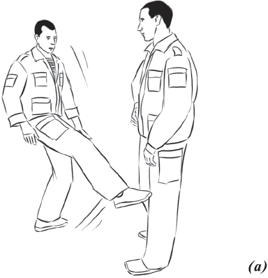 Удар ногой снизу, прямо выполняется из изготовки к бою. Разворачивая таз по направлению удара, перенести тяжесть тела на опорную ногу, одновременно другую ногу вынести коленом вперед и быстрым разгибанием голени нанести удар (рис. 32).