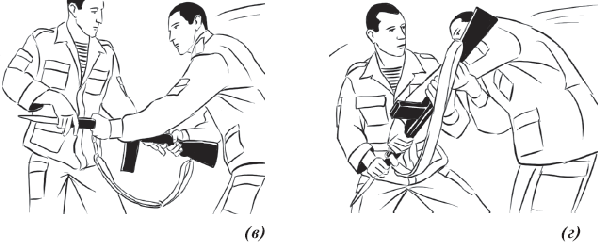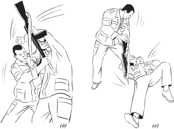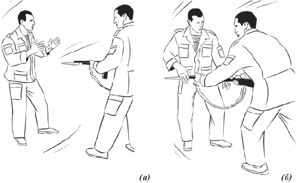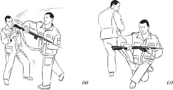 После чего, ухватившись правой рукой за цевье автомата, а левой рукой – за шейку приклада, приседая с шагом правой ногой назад вывернуть автомат во внешнюю сторону от противника. Обезоруживая его, провести контратакующие (конвоирующие) действия (рис 54);