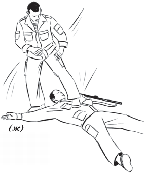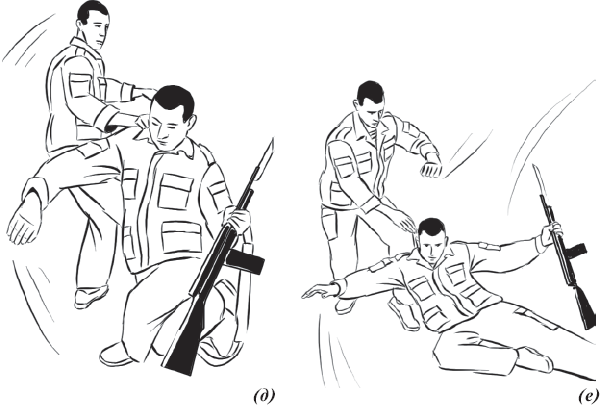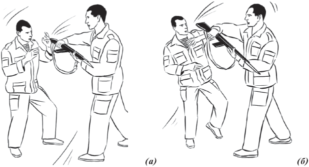 • с уходом вправо: из изготовки к бою. С шагом правой ногой вперед в сторону принять поступательно-ударное движение противника кистью правой (левой) руки в плоскости нанесения с его внешней стороны и подшагом левой ногой, одновременно подхватывая левой рукой под ствольную часть автомата, а правую руку посылая под руку противника, удерживающего оружие за шейку приклада, приседая с шагом правой ногой назад, обезоружить противника (рис 55).