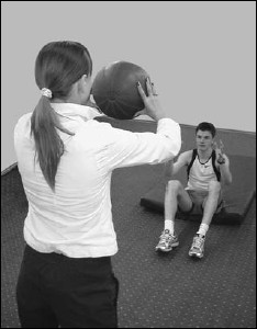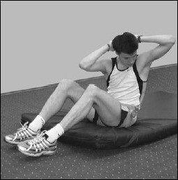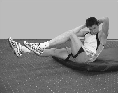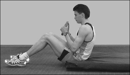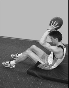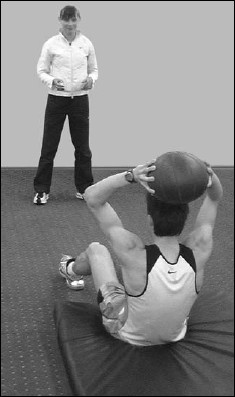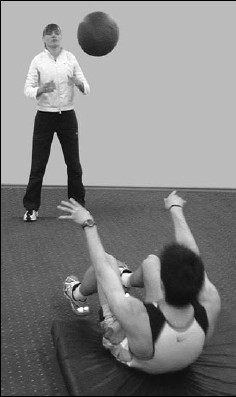 Исходное положение для выполняющего упражнение: сидя, ноги согнуты в коленных суставах, стопы стоят на полу, согнутые в локтевых суставах руки держат над головой набивной мяч.