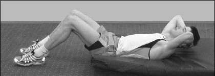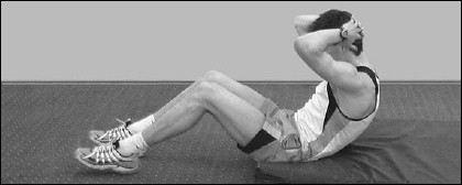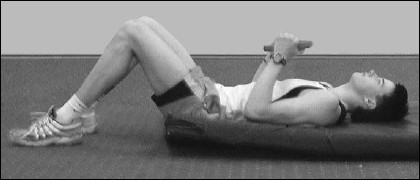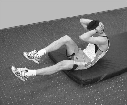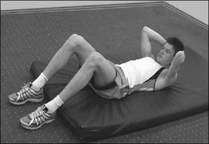 1 Примите исходное положение: лягте на спину, руки сцепите за головой. Ноги согнуты в коленных суставах, стопы стоят на полу (см. соответствующий рисунок из предыдущего упражнения).