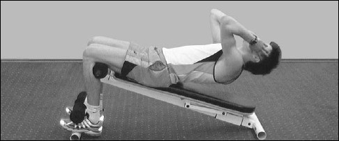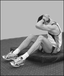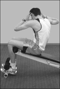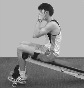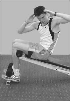 1 Примите исходное положение: сядьте на наклонную скамью, руки держите у висков (см. соответствующий рисунок из предыдущего упражнения).