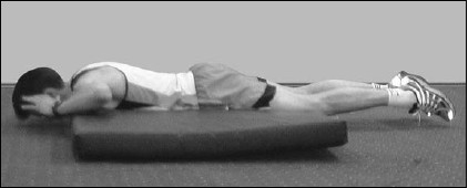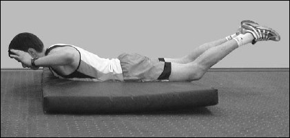 1 Примите исходное положение: лягте на живот, руки сцепите за головой, ноги соедините вместе.