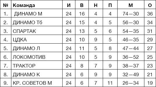 В составе новых чемпионов выступали: вратари Евгений Фокин, Николай Бычков, Николай И. Медведев, защитники Всеволод Радикорский, Аркадий Чернышев, Иван Станкевич, Гавриил Качалин, Николай С. Медведев, Николай Палыска, полузащитники Евгений Елисеев, Алексей Лапшин, Николай Поставнин, Всеволод Блинков, нападающие Михаил Семичастный, Михаил Якушин, Сергей Соловьев, Николай Дементьев, Сергей Ильин, Валерий Бехтенев, Алексей Пономарев, Василий Трофимов, Александр Назаров. Тренер-Борис Аркадьев, начальник команды-Иван Хайдин.