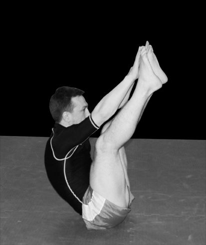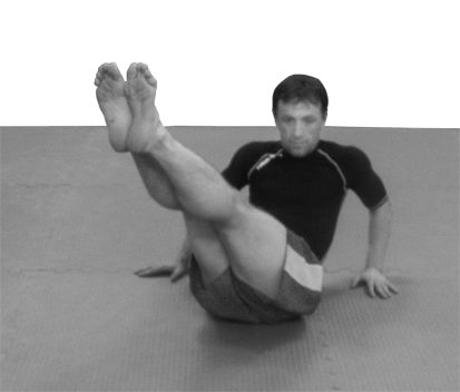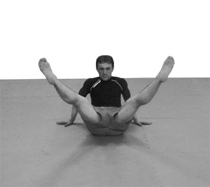6. Упражнение на пресс – сядьте на пол, упритесь локтями в пол и поднимите корпус и ноги. Выполняйте упражнение «ножницы» – ритмично сводя и разводя прямые ноги. Выполнив 150 сведений-разведений, не прерываясь, сделайте 30 вращений прямыми ногами по часовой и 30 вращений против часовой стрелки. После этого положите руки за голову и останьтесь сидеть на полу с поднятыми выпрямленными ногами и поднятым корпусом и сразу начинайте ритмично скручивать корпус вокруг оси в одну и в другую сторону, выполнив таким образом не менее 60 скручиваний. Все вышеописанное упражнение выполняется нон-стоп, не опуская ног на землю (рис. 9—14).