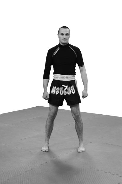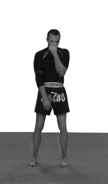 2. Вторая стойка – непосредственно боевая позиция, принимаемая либо в учебном спарринге, либо уже во время боя. Из стойки № 1 делаем шаг правой ногой назад и поднимаем руки в боевую позицию (рис. 23, 24). В стойке № 2 колени чуть согнуты и вес распределен равномерно на обе ноги. Для правшей левая нога находится спереди, ступня полностью на земле, носок повернут немного внутрь, так, чтобы левое колено прикрывало пах. Правая нога стоит сзади на носке, пятка приподнята. Такая стойка, с одной стороны, обеспечивает необходимую устойчивость, а с другой – облегчает передвижения и позволяет с большей легкостью наносить удары ногами и руками. И еще одно соображение: если вы получите мощный удар или толчок, вам будет легче сохранить равновесие – вы просто отлетите назад, сохранив боевую позицию и не потеряв равновесие. Голова должна быть утоплена в плечах, а подбородок прижат к груди, это необходимо для того, чтобы максимально прикрыть от ударов одну из самых уязвимых зон – челюсть. Левая рука ведущая – кисть плотно сжата в кулак, левое плечо прикрывает челюсть. Кулак правой руки закрывает челюсть с другой стороны. Локти обеих рук прижаты к корпусу и прикрывают ребра. В зависимости от дистанции, на которой ведется бой, стойка может быть почти фронтальной или, наоборот, боковой. Если противник находится на дальней дистанции, целесообразно держать боковую стойку, при которой вы представляете меньшую мишень и можете быстрее двигаться и наносить быстрые удары передней рукой и ногами. Чем ближе вы к противнику, тем стойка должна становиться более фронтальной, что нужно для большей устойчивости при сериях руками и для облегчения подключения мощных ударов правой рукой или ногой.