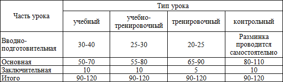 Время на каждую часть урока в зависимости от его типа распределяется соответственно (табл. 32).