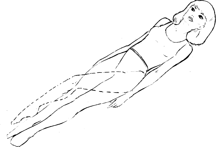 1. Потягивание. Само название говорит о том, что надо делать. Лежа на спине, вытяните ноги, сильно выпрямляя колени и ступни. Одновременно вытяните руки над головой, выпрямляя пальцы и сильно напрягаясь. Потом полностью расслабьте мышцы, опустив руки вдоль тела.