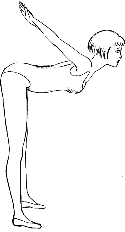 4. Исходное положение – стоя, ноги расставьте и выпрямите, кисти рук сцепите за спиной ладонями кверху. Сделайте выдох и медленно наклоняйтесь вперед, поднимая при этом сцепленные руки как можно выше, одновременно с головой. Если почувствуете, что упражнение дается вам легко, усложните его. Наклоняйтесь вперед, стараясь коснуться головой колен, и поднимите сцепленные за спиной руки вверх. Останьтесь в этом положении как можно дольше.