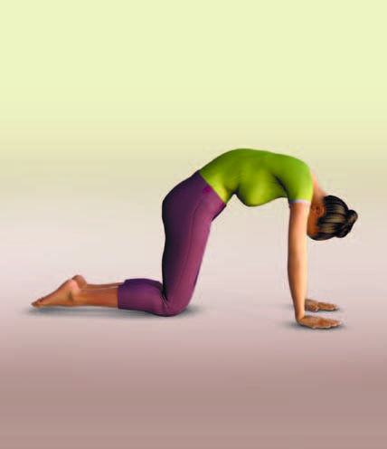 Широко разводим пальцы, вдыхаем, удерживая руки и бедра вертикально прямо. На выдохе вгибаем спину по направлению к полу. На вдохе поднимаем верхнюю часть спины. Повторяем движение позвоночником на вдохе-выдохе в течение минуты.