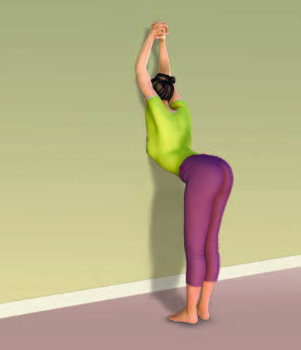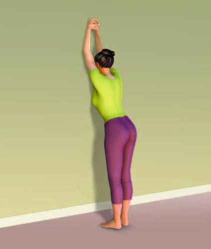 Исходное положение – стоя лицом к стене, обе ступни установлены на некотором расстоянии от стены параллельно друг другу, руки вытянуты вверх вдоль стены в направлении потолка. Сгибаем локти, складываем руки треугольником, пальцы сплетаем в замок.