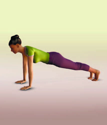 На вдохе опускаем бедра вниз, добиваясь, чтобы туловище оказалось на прямой линии от головы к ступням, напрягая и выпрямляя руки.