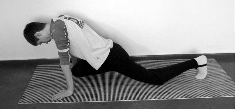 1. Исходное положение: стоя на четвереньках, опираемся на ладони, спина выгнута вверх, подбородок прижат к груди.