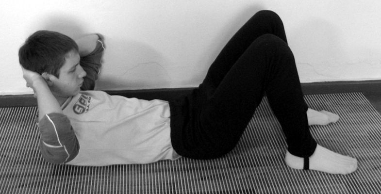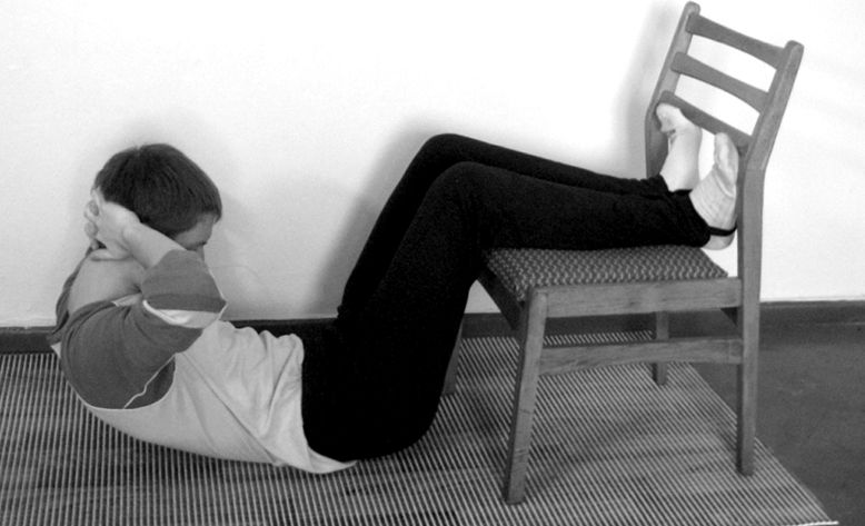 1. Исходное положение: лежа на полу – руки за голову, согнутые в коленях ноги поднять на стул, гимнастическую скамейку или диван (если диван низкий – бедра прижать к вертикальной плоскости дивана).