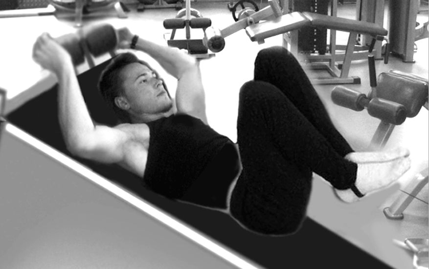 1. Исходное положение: лежа на наклонной доске, голова в верхней точке, руками держимся за упор (ручки) тренажера, ноги прямые.