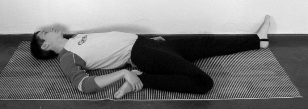 Согнутую в колене ногу развернуть в сторону и положить на пол (рис. 2.25), одновременно плавно опуститься на спину.