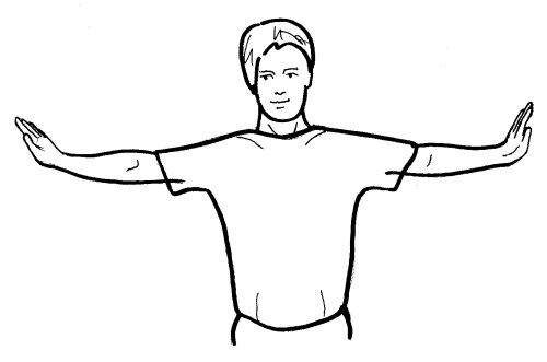 Исходное положение. Выпрямите руки в локтях и через стороны поднимите их до уровня плеч; кисти направьте вверх и расположите перпендикулярно полу; пальцы соберите вместе (рис. 2).
