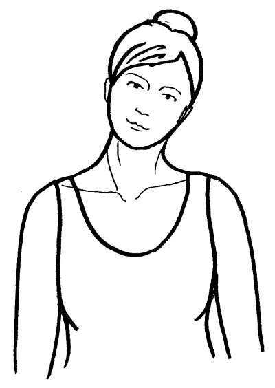 Исходное положение. Мягко наклоните голову влево так, чтобы приблизить подбородок к левой ключице. Плечи не поднимайте. Взгляд устремите влево.