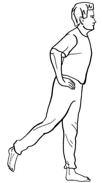 Теперь поднимите прямую ногу в сторону (рис. 8). Снова вернитесь в исходное положение. Повторите еще 2 раза. Наконец, отведите прямую ногу назад (рис. 9). Опустите ногу. Повторите еще 2 раза. Проделайте указанные движения другой ногой.