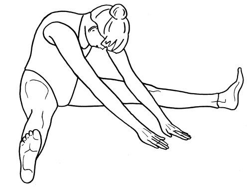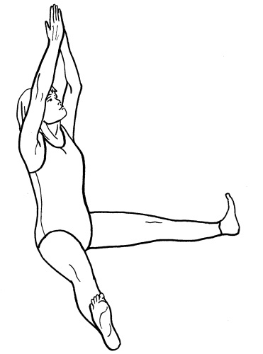 Исходное положение. Сядьте на пол, ноги как можно шире разведите в стороны, стопы натяните так, чтобы пальцы были направлены вверх, руки свободно опустите.