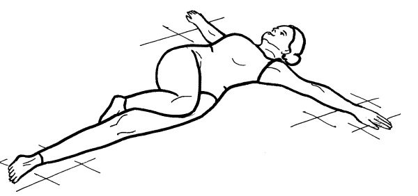 Исходное положение. Лягте на спину, ноги выпрямите и сдвиньте вместе, руки разведите в стороны, прижав ладони к полу.