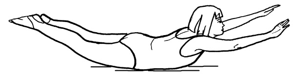 Исходное положение. Лягте на живот, руки вытяните прямо перед собой, лбом упритесь в пол.