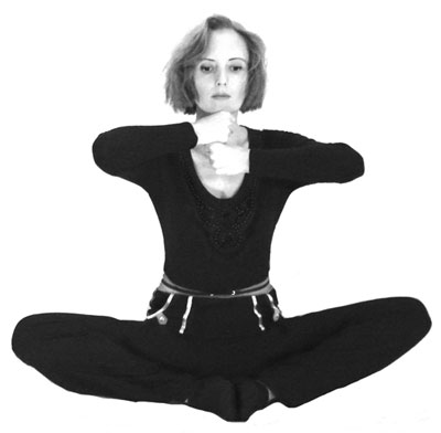 3. ПОКЛОНЫ МУДРЕЦА. Сидя «по-турецки» (спина прямая), сжимаем пальцы рук в кулаки и кладем один кулак на другой. Подбородком упираемся в кулаки, локти расположены перпендикулярно к туловищу, то есть параллельно земле (рис. 3). Наклоняем голову вперед, сильно опираясь на сопротивляющиеся руки. Выполнив три-четыре поклона, опускаем руки свободно вдоль туловища. Повторяем упражнение 5–7 раз. Вдох делаем в момент поклона.