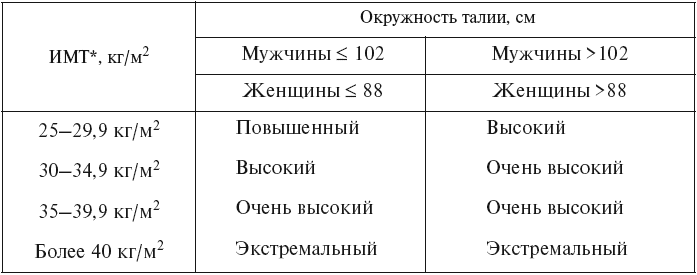 Таблица 1. Оценка риска развития заболеваний и состояний, ассоциированных с избыточной массой тела