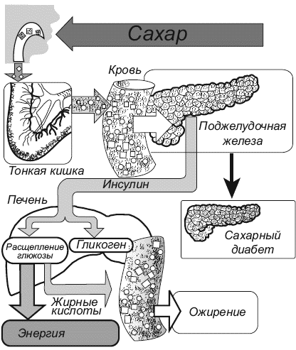 Ожирение ведет к нарушению функции практически всех эндокринных желез (рис. 1). Например, отмечается снижение потребления глюкозы тканями и повышение ее концентрации в крови, т. е. развивается гиперфункция бета-клеток поджелудочной железы, выделяющих в ток крови инсулин. Через некоторое время после усиленной секреции инсулина наступают дегенеративные изменения бета-клеток и функциональное снижение толерантности к глюкозе, что ведет к развитию устойчивого сахарного диабета.