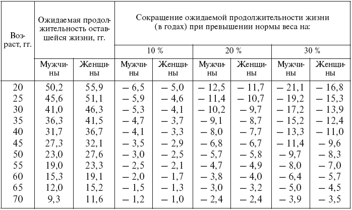Таблица 2. Сокращение ожидаемой продолжительности жизни при превышении нормы массы тела