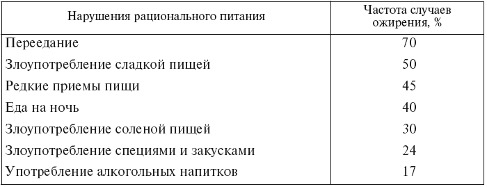 В табл. 3 представлены данные исследователей, свидетельствующие о том, насколько часто нарушения принципов рационального питания приводят к ожирению.