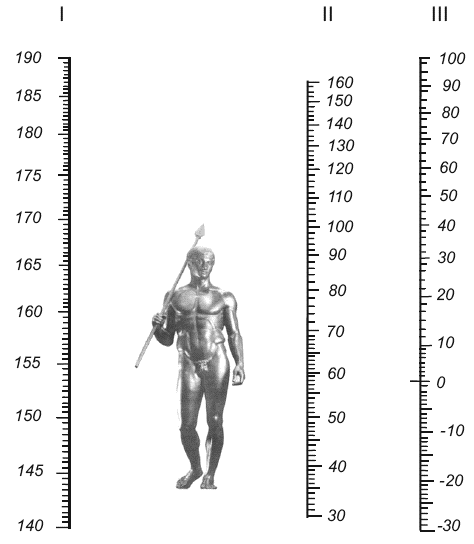 Методика пользования номограммами. На рис. 4–7 изображены 3 шкалы: I – рост, см; II – масса тела, кг; III – процент отклонения от идеальной массы. Для нахождения идеальной массы надо соединить линейкой величину, соответствующую росту на шкале I (рост в сантиметрах) с точкой «ноль» на шкале III, тогда на шкале II получим цифру идеальной массы. Соединив значение роста со значением реальной массы тела, найдем на шкале III процент отклонения от идеала.