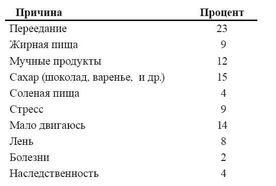 На сайте (http://h.mynlp.m/) анонимно опрошено 2000 человек. Каждый из них поделился мнением о причинах избыточного веса. Результаты в процентах от общего числа приведены в табл. 3.