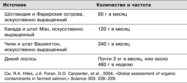 Авторы сделали вывод, что употребление в пищу искусственно выращенного лосося чаще одного раза в месяц может повысить риск развития рака. Подробнее данные о количестве рыбы, которую можно есть, не опасаясь за здоровье, приведены в таблице 2.2.