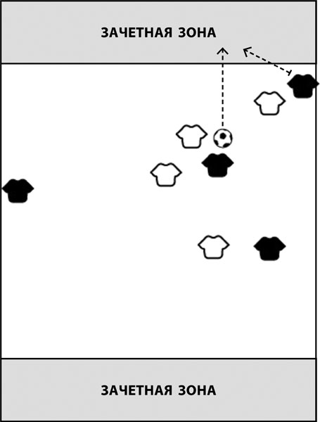 Тренеру на заметку: Одной из самых распространенных ошибок, которую совершает игрок с мячом, является попытка втиснуть мяч в тот же вектор, по которому бежит атакующий игрок. Чаще всего эта тропинка оказывается слишком узкой для двоих. Золотое правило: мяч идет по одному вектору, игрок атаки бежит по другому. Игрок с мячом должен выполнить передачу в точку, в которую двигается нападающий, а не в ту, где он находится. Моим любимым упражнением на отработку проникающих передач является игра «Зачетная зона» (схема 16.2).