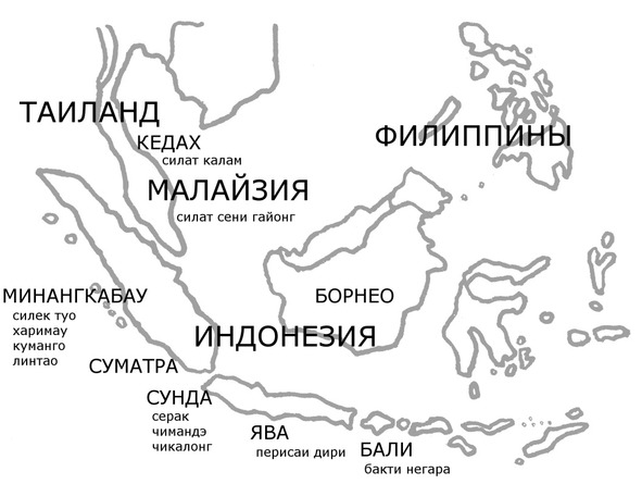 Рисунок 1. Основные острова Индонезии с наиболее известными стилями пенчак силата.